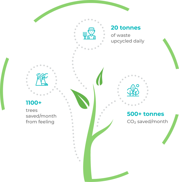 Traditional paper making uses gallons of water and releases toxic effluents and emissions into our environment.Our patented circular fibre technology ensures zero effluent waste , minimal water usage, and low carbon emissions. We are truly Circular, and our by-products can be used in other industries due to our NO WASTE MANUFACTURING